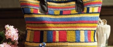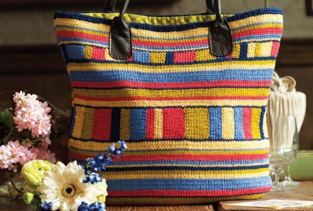 Цветная вязаная летняя сумка выполнена спицами чередованием горизонтальных и вертикальных полос.