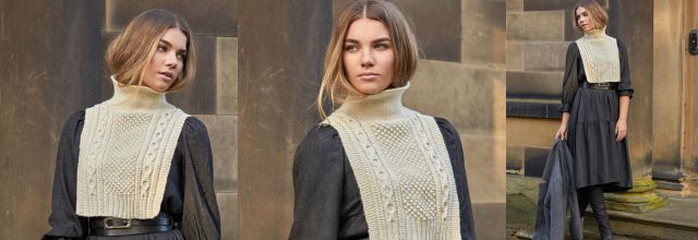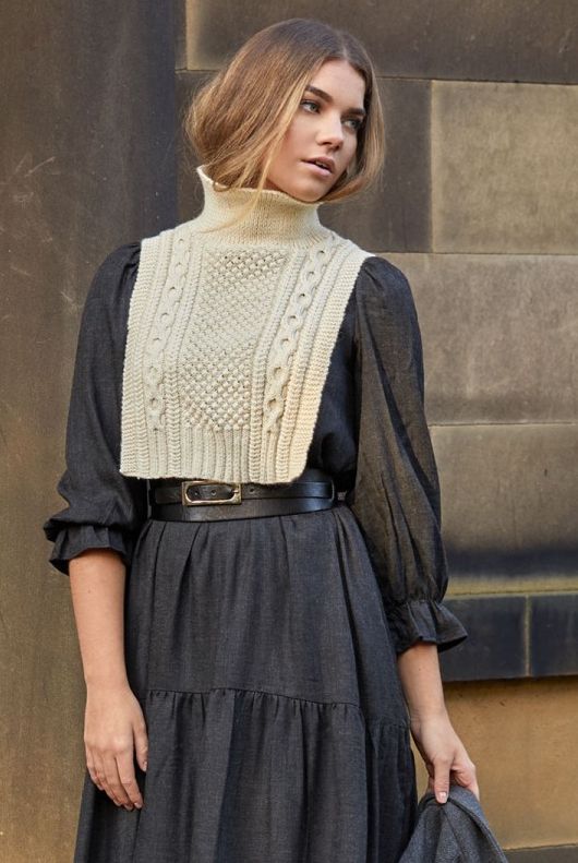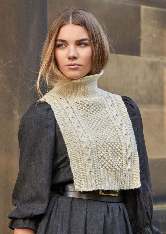 Красивая и удобная вязаная манишка Arden с высоким воротником-стойкой выполнена роскошным узором из кос и «ежевики». Такая манишка надежно защитит от холода шею и станет прекрасной альтернативой широким теплым шарфам. Ее можно надеть под зимнюю одежду с любым воротником, такая манишка прекрасно ляжет и не будет создавать лишний объем.
