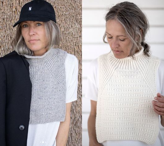 Оригинальная вязаная манишка CozyCowl с графичным текстурным узором. Сначала выполняется перед, затем спинка, далее соединяются плечи и вяжется воротник.