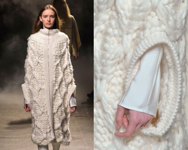 И конечно же осенью никак не обойтись без вязаного пальто. Необыкновенное белоснежное пальто на молнии из коллекции Aganovich выполнено очень крупной вязкой, которая вот уже несколько сезонов не выходит из моды.