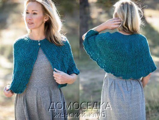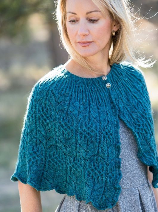 Чтобы связать накидку потребуется: 4 мотка пряжи (50% шелк, 50% шерсть; 188 м/100 г); длинные круговые спицы 5 мм; трикотажная игла; 2 пуговицы.