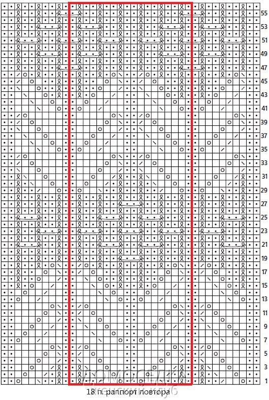 Набрать 290 (362) п. Вязать 1-56 р. по схеме 1, затем 1-18 р. еще 1 раз.