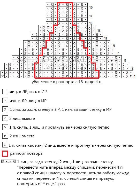 След. р. (ИС): 1 изн. за задн. стенку, [2 лиц. вместе, 1 изн. за задн. стенку, 1 п. снять, 1 лиц. и протянуть её через снятую петлю, 1 изн. за задн. стенку] 2 раза, далее изнаночные до последних 9-ти петель, 1 изн. за задн. стенку, [1 лиц., 1 изн. за задн. стенку] 4 раза.
