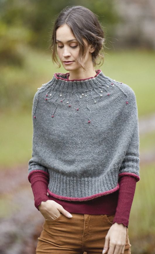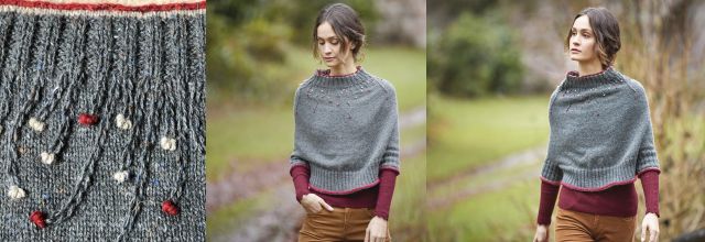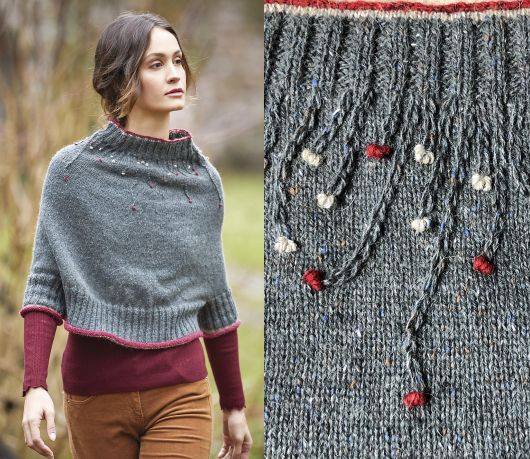 Оригинальная стильная вязаная пелерина Kincardine с рукавами и свободным воротником-стойкой выполнена по кругу без швов сверху вниз, начиная от горловины и украшена изящной вышивкой из пряжи контрастного цвета. Пряжей контрастного цвета отделаны края горловины, низ рукавов и переда со спинкой.