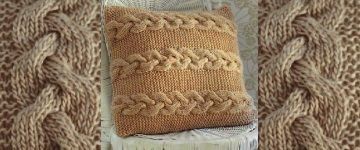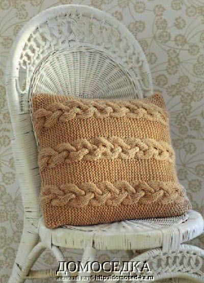 Симпатичная вязаная подушка выполнена спицами узором с косами.