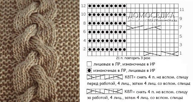 Примерная плотность вязания: 18 п. и 21 р. = 10х10 см спицами 5 мм.