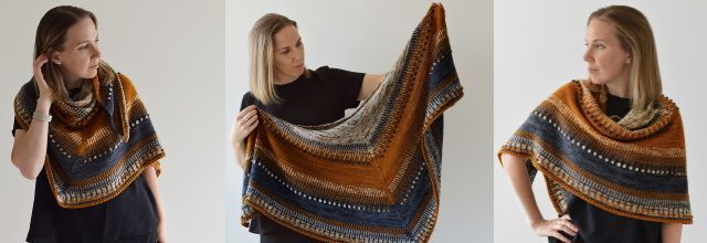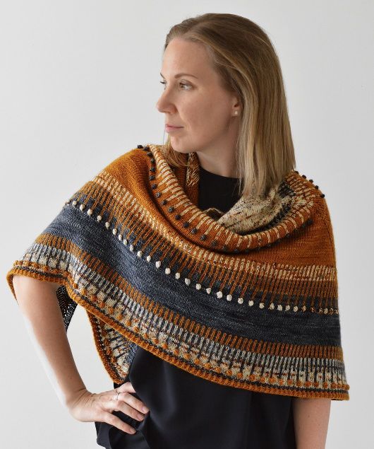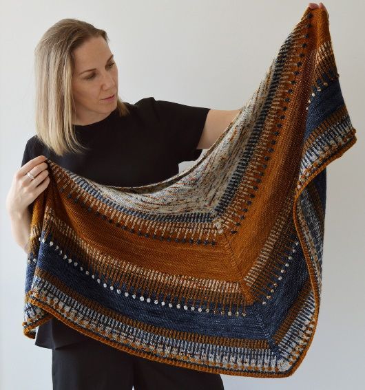 Симметричная треугольная шаль Ambershore вяжется сверху вниз в контрастной цветовой гамме с простым жаккардом и шишечками. Навеяно вымытым янтарем среди высыхающих водорослей на белом песчаном побережье Балтийского моря. Шаль состоит из чередующихся полос лицевой глади и простого жаккарда с крошечными шишечками, вязаными крючком, и заканчивается скрещенной резинкой по краю. Жаккард выполняется как на лицевой, так и на изнаночной стороне шали.