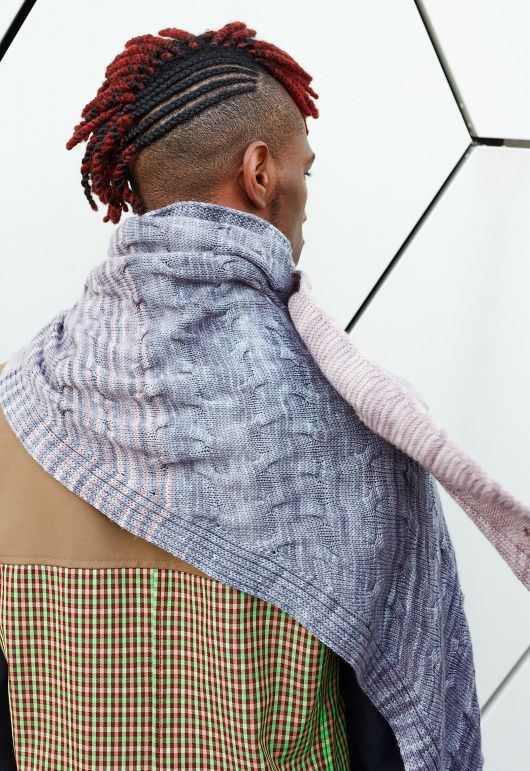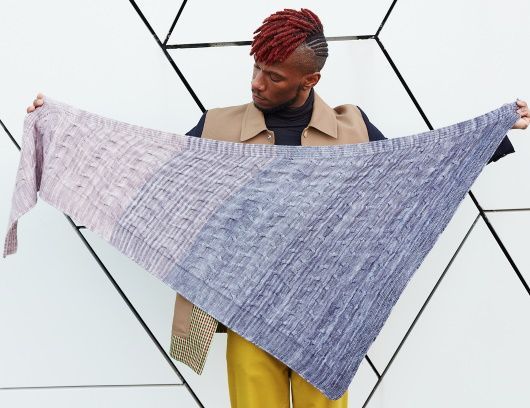 Теплая вязаная шаль CabledBliss асимметричной формы выполнена рельефным узором.