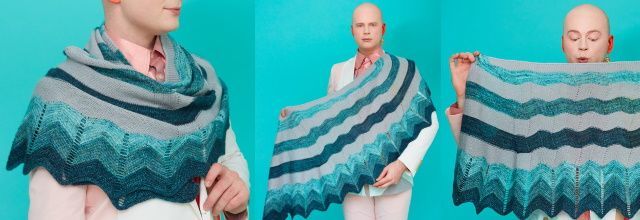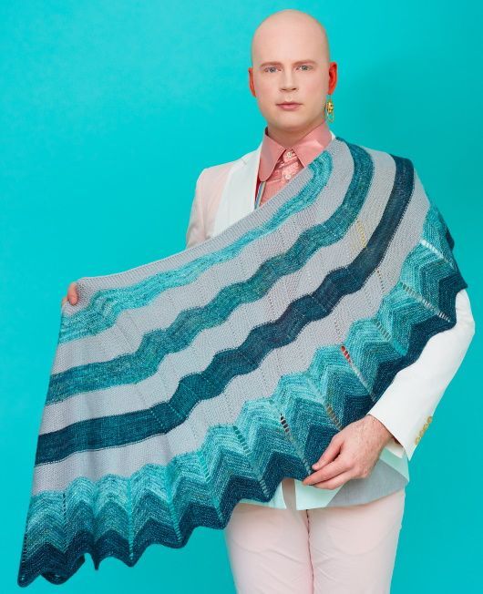 Прекрасная вязаная шаль ChoppyWaves имеет основной цвет West Wool Bicycle, подчеркнутый тремя окрашенными вручную контрастными цветами. Убавления и прибавления в рядах образуют геометрический волнистый мотив с полосками лицевой глади и изнаночной глади. Кайма вяжется лицевой гладью, тремя контрастными цветами вместе.