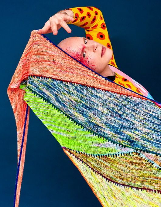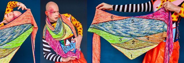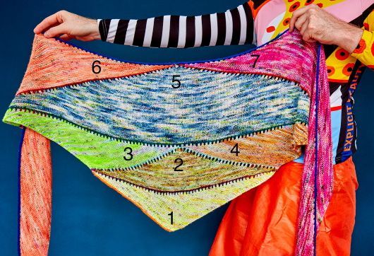 Выберите палитру цветов пряжи FingeringWeight, чтобы связать этот дизайн шали с укороченными рядами. Лоскуты платочной вязки демонстрируют отдельные мотки и остатки пряжи. Есть семь секций, в которых вы можете поиграть с пестрой или однотонной пряжей, идеально подходящей для демонстрации сувенирных моточков из путешествий и с фестивалей пряжи. Проушины контрастного цвета украшают секции платочной вязки, а края полого шнура обрамляют треугольную форму шали.