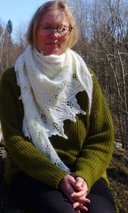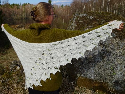 Нарядная вязаная шаль TangledVine выполнена спицами комбинированным узором из кос и листьев.