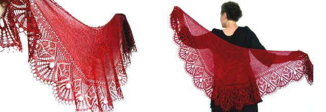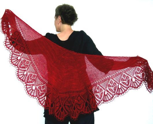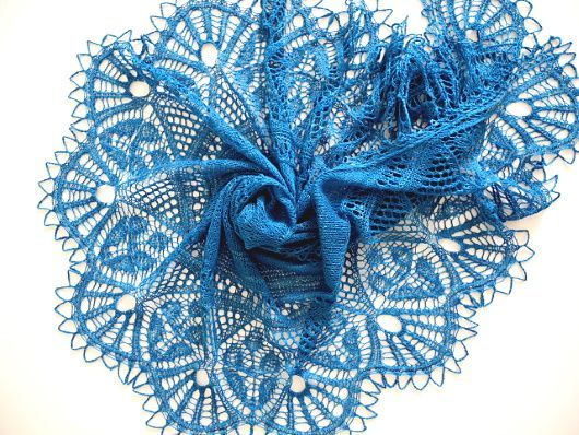 Плотность вязания (после блокировки): 19 п. и 32 р. = 10 см. лицевой гладью из пряжи Wollmeise Lace Garn прибл. 20 п. и 27 р. из пряжи Dye For Yarn Lace Silk. Плотность вязания не имеет решающего значения, но, повлияет как на количество использованной пряжи, так и на конечный размер шали.