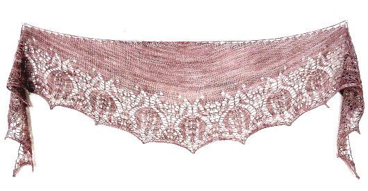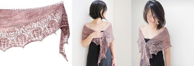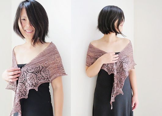 Вязаная шаль Tulip выполняется от верхнего края вниз, сначала простой лицевой гладью, а затем ажурным узором.