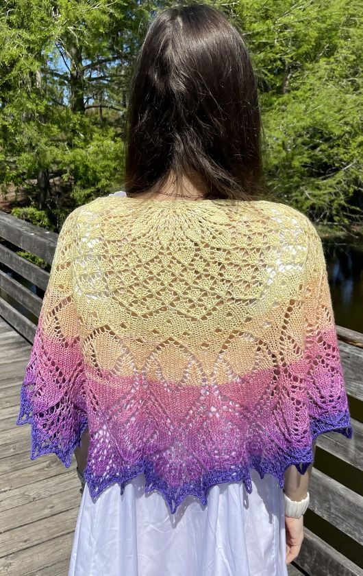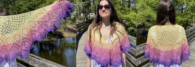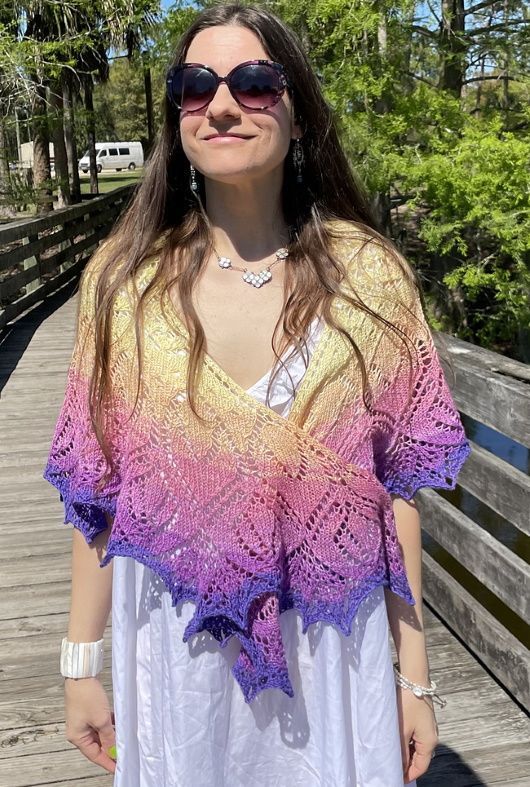 Пряжа: Violet Lynx Dyeworks Topaz 600 (55% Шерсть, 45% Шелк; 600 м./100 гр.), цвет Dance of Fire and Ice, использованная для шали, изображенной выше – около 600 м. Может быть связана из пряжи различной толщины – паутинкой (для шали меньшего размера), ажурной (как на фото), fingering или даже DK.