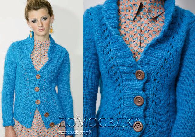 Аккуратно удалить вспомогательную нить из наборного ряда и перенести 22 (24, 28, 30, 34, 36) п. на обоюдоострые спицы. С лицевой стороны на круговые спицы, начиная от нижнего края правой стороны переда, поднять 92 (95, 96, 98, 99) лиц. (для правой планки), далее вязать 22 (24, 28, 30, 34, 36) лиц. с обоюдоострых спиц (для ворота), затем поднять сверху вниз по левой стороне переда 92 (95, 96, 98, 99) лиц. (для левой планки) = 206 (214, 218, 222, 230, 234) п.