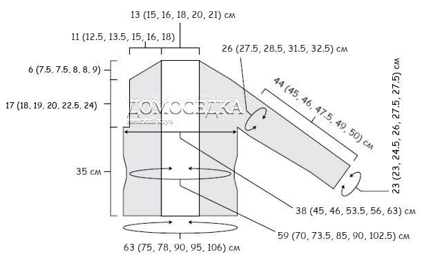 Повторить последние 2 ряда еще раз = 106 п., из них по 16 п. для каждой передней стороны, 50 п. для спинки и по 12 п. для каждого рукава.