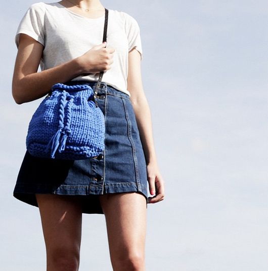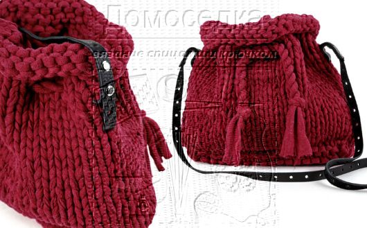 Для вязания сумочки потребуется 2 мотка трикотажной пряжи Лента (100% хлопок, 95-100 м/350-380 г) и круговые спицы 10 мм длиной 60 см; готовый кожаный ремешок длиной примерно 50 см.