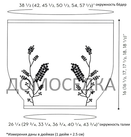 Продолжить основной вязкой и равномерно прибавить 10 петель в следующем круге, затем в каждом 12-м круге 6 (6, 6, 7, 7, 7) раз следующим образом: [вязать до 1-й петли перед маркером, из 1 петли вязать 2 лиц (за передн. и за задн. стенки, M] 4 раза, далее вязать до 2-х последних петель, из 1 петли вязать 2 лиц (за передн. и за задн. стенки), довязать 1 петлю = 221 (241, 261, 291, 311, 331) петля после всех прибавлений. Далее вязать прямо, пока длина полотна не составит 39 (40, 41, 42, 44, 45) см или желаемой длины. Закрыть все петли по рисунку.