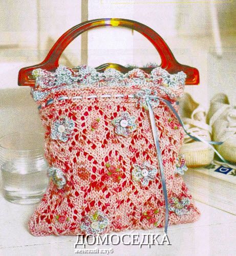 Весенняя вязаная сумка от Луизы Хардинг выполнена из пряжи нежных оттенков с добавлением шелка и украшена маленькими розочками.