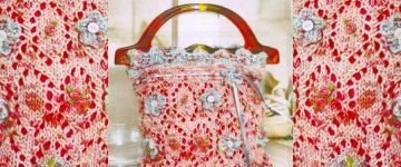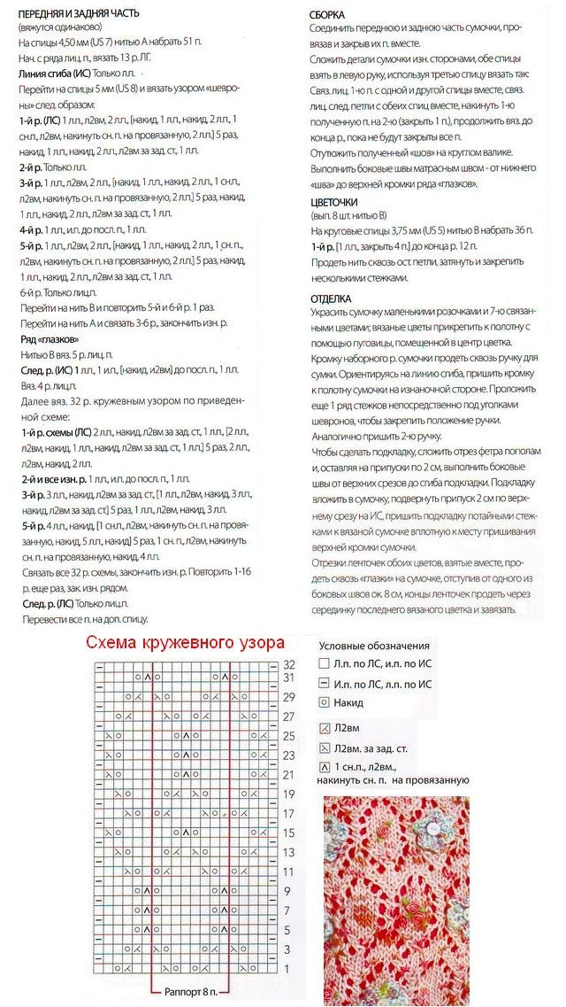 Для вязания потребуется 1 моток пряжи А – цвета инея и 2 мотка B – креветочного цвета (шерсть/шелк, 100 м/50 г); прямые спицы №4,5 и №5; маленькие розочки из ткани – 7 шт.; маленькие перламутровые пуговицы – 7 шт.; ленточки двух цветов – по 1 м каждая; пара округлых ручек для сумки шириной 28 см; лоскут фетра 29х58 см.