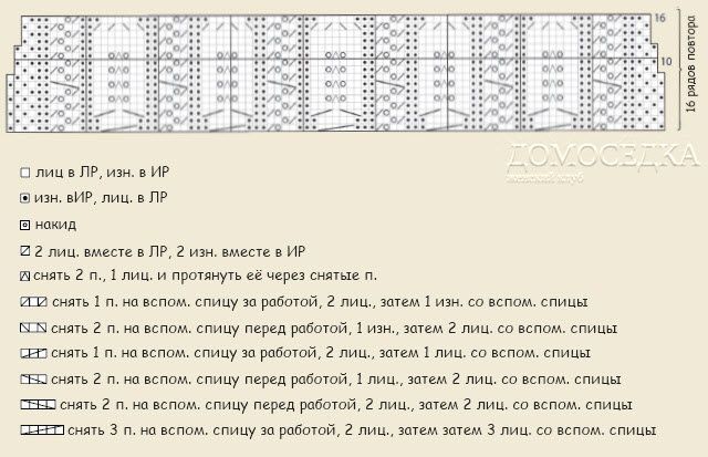 Плотность вязания: 26 п. и 30 р. = 10х10 см основной узор спицами 4 мм.