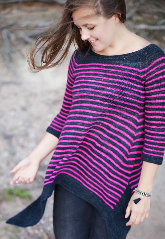 Вязаная туника FastForward с круглым вырезом горловины и рукавами реглан длиной три четверти выполнена без швов сверху вниз по кругу узкими полосами двух контрастных цветов. По боковым сторонам платочной вязки выполнены интересные асимметричные вставки. Она дарит свободу движения и гарантировано подчеркивает достоинства фигуры, а также тактично уводит внимание от недостатков.
