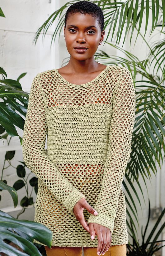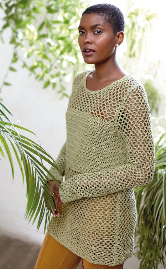 Женственная вязаная туника Messina с длинными вшивными рукавами связана крючком и привлекает взгляд роскошным узором. Сочетание ажурной сетки и плотной вязки делает эту модель универсальной. Туника с глубоким круглым вырезом горловины выполнена снизу вверх из отдельных деталей, которые затем сшиваются вместе.
