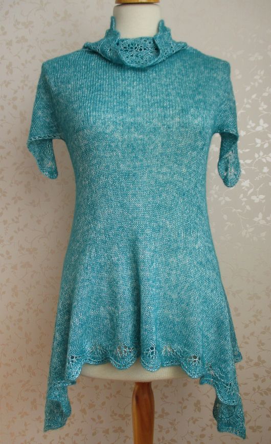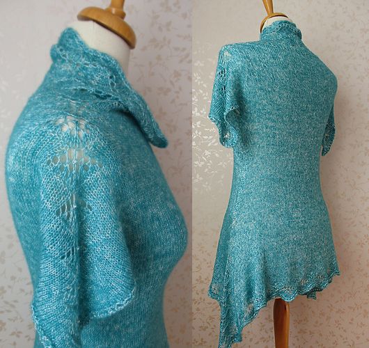 Роскошная вязаная туника Ocean Surf выполнена спицами сверху вниз единым полотном круговыми рядами. Необыкновенный ажурный узор украшает воротник, плечи с рукавам и обрамляет асимметричный низ изделия, формируя волнистый край. Для вязания туники рекомендуется тонкая струящаяся пряжа с добавлением шелка или вискозы.