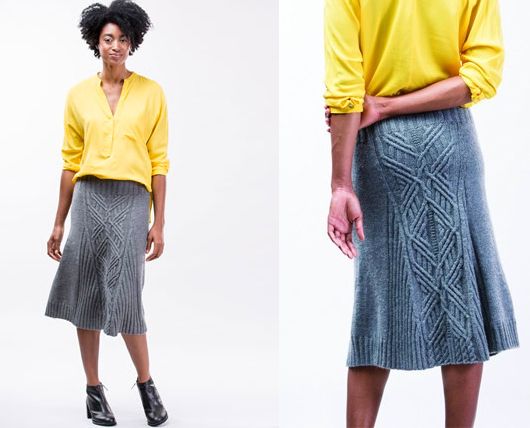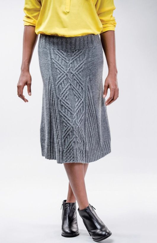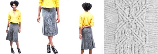 Шикарная теплая вязаная юбка от Норы Гоган выполняется спицами снизу вверх. Переплетения из аранов формируют основное полотно. Плотная широкая резинка отлично подчеркивает талию.