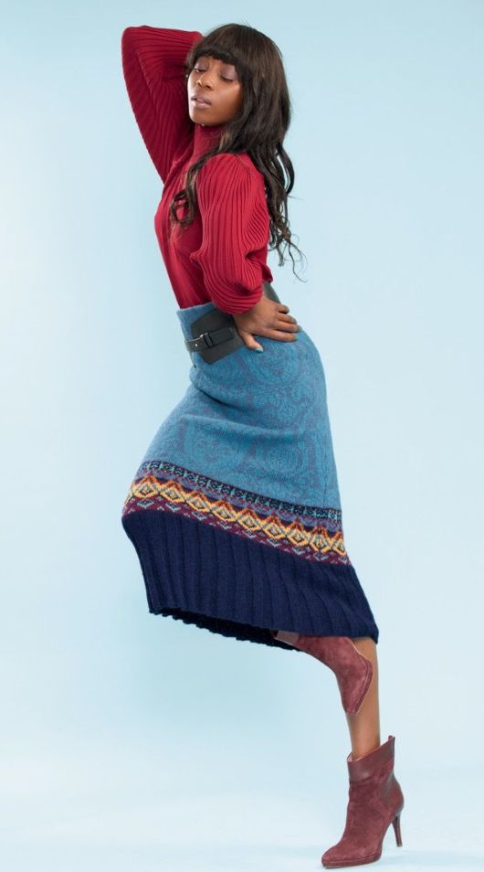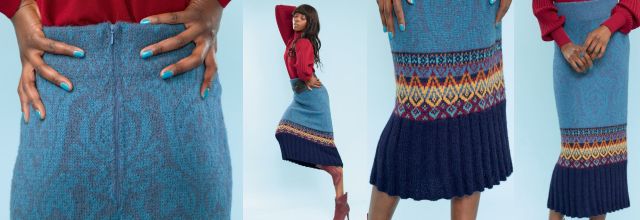 Узкая вязаная юбка KaySkjort выполняется спицами снизу вверх по кругу цветным узором.