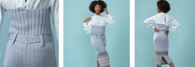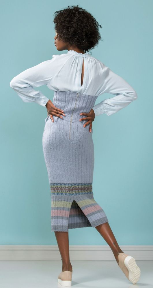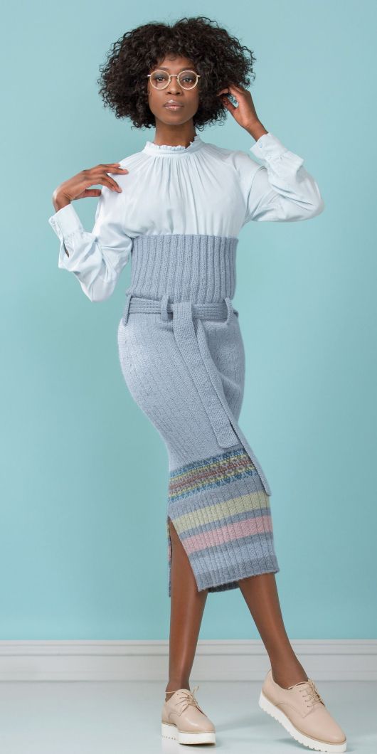 Оригинальная вязаная юбка Lily выполнена снизу вверх резинкой. Широкий пояс красиво облегает тело. Красивый цветной узор украшает подол.