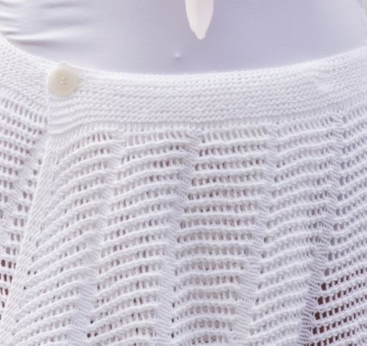Шикарная расклешенная вязаная юбка от CHANEL с запахом выполняется спицами чередованием полос диагонального сетчатого узора и клиньев лицевой глади.