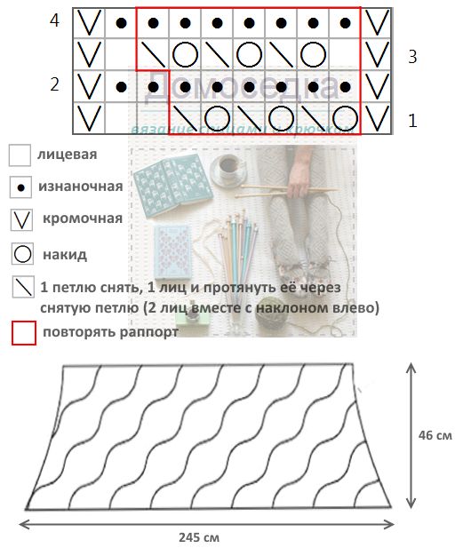 ***Дальше вязать узором Сетка по схеме, начиная и заканчивая кромочными петлями, повторяя 8 петель. Связать ажурную полосу шириной примерно 4 см (22 ряда), закончить в изнаночном ряду.