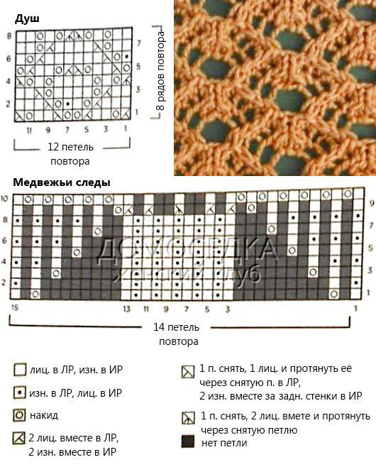 След. р. (ЛС): 2 лиц., затем узор Душ по схеме начиная с 1-й (7-й, 1-й) петли и заканчивая 12-й (6-й, 12-й) петлей до 2-х последних петель ряда, 2 лиц.