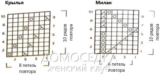 След. р. (ЛС): 1 лиц. (кром.), затем узор Милан по схеме до последней петли, 1 лиц. (кром.).