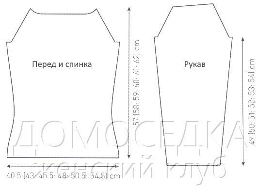 Повторить прибавления с каждой стороны в каждом следующем 6-м ряду 2 раза, затем в следующем 8-м ряду 1 раз = 50 (52, 56, 58, 62, 66) петель.