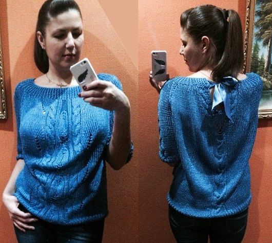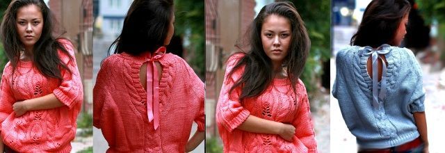 Популярный пуловер с разрезом на спине связала Наталья Брыкалова из Нижнего Новгорода.