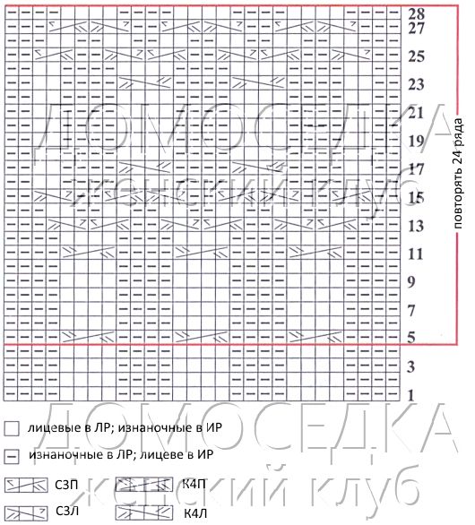К4П = снять 2 петли на вспом. спицу за работой, 2 лиц, затем 2 лиц со вспом. спицы.