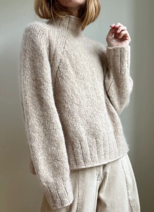 Классический вязаный свитер оверсайз реглан с высоким воротником и боковыми разрезами. Этот элегантный трикотаж с красивой драпировкой и удобным свободным силуэтом. Рукава широкие и сужаются к манжетам. Линия горловины формируется с помощью укороченных рядов после провязывания края. Поскольку свитер вяжется сверху вниз, вы можете легко примерять его в процессе работы.
