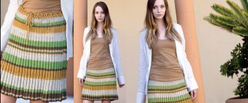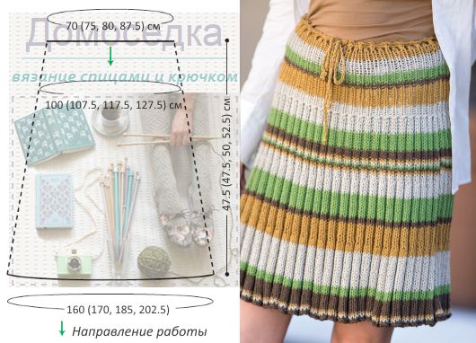 Вязание юбки с эффектом плиссе в полоску от Lise Solvang выполняется спицами круговыми рядами сверху вниз.