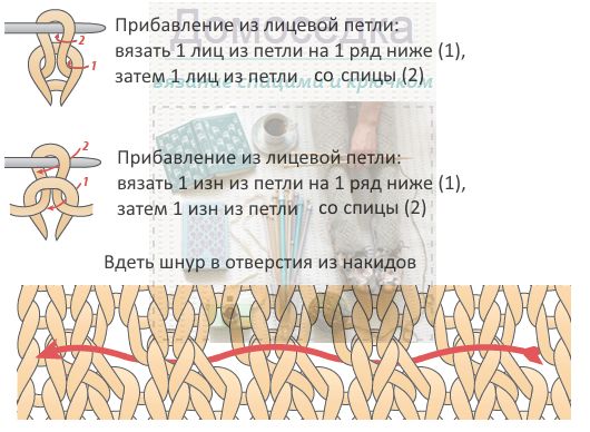 Круг прибавлений 1: из каждой петли вязать по 2 петли, формирую резинку 2 лиц, 2 изн (см. фото) = 224 (240, 260, 284) петли.