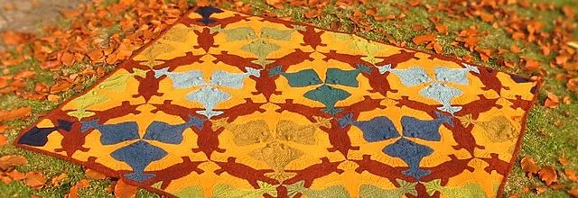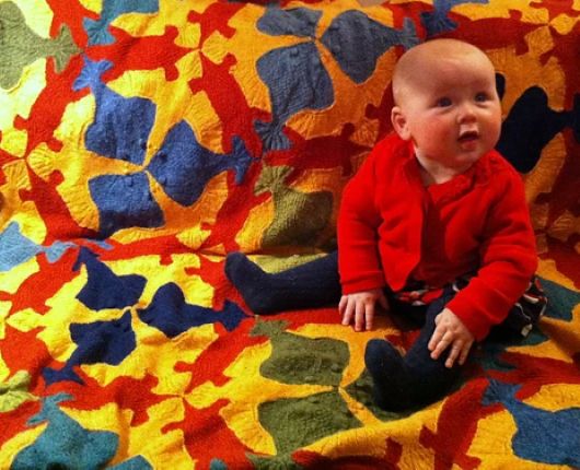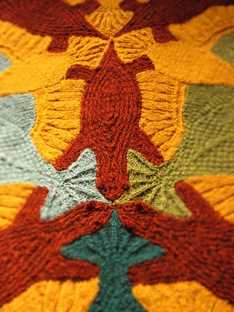 Вязаное лоскутное одеяло OnTheShore (на берегу), вдохновленное знаменитыми мозаиками M. C. Escher. Черепахи, утки и рыбы расположены в идеальной симметрии и образуют потрясающий узор. Очень подробные животные вяжутся по одному и сделаны для больших переносных проектов. Их можно вязать в дороге и сшить вместе дома!