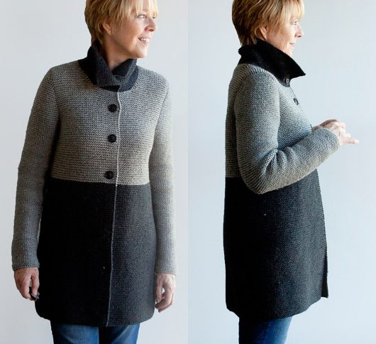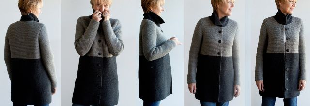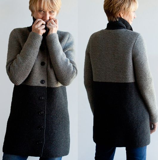 Вязаное пальто Brooklyn выполнено сверху платочной вязкой из контрастных цветных блоков и слегка расширяется внизу. Цвет нижней части пальто, которая начинается немного выше линии талии, повторяется на уютном отложном воротнике, который застегивается на пуговицу. Рукава связаны отдельно сверху вниз и затем вшиты в проймы.