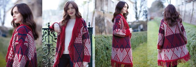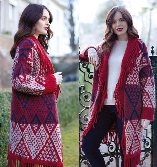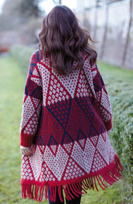Роскошное длинное вязаное пальто Carmine с отделкой краев бахромой выполнен прекрасным жаккардовым узором из мягкой пряжи трех контрастных цветов.