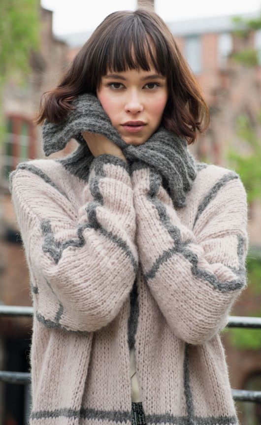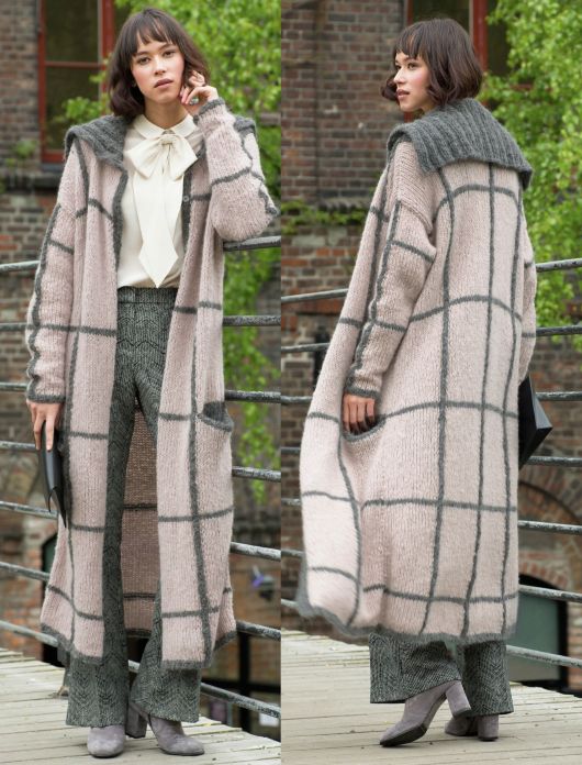 Роскошное вязаное пальто CitysquareLangjakke длинное, теплое и уютное с карманами и высоким воротником.