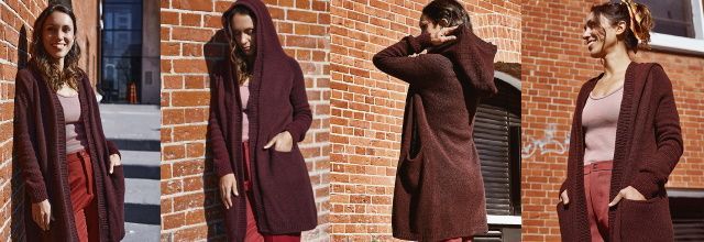 Пряжа: 11 (12, 13, 14, 15, 17, 18, 20, 21) мотков Baby Yak Medium by mYak (100% бэби як; 117 м/50 г]), или приблизительно 1228 (1345, 1462, 1579, 1755, 1930, 2106, 2281, 2457) метров пряжи worsted-weight yarn. Показан образец в цвете Burgundy.