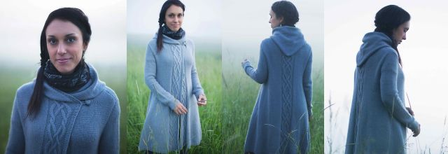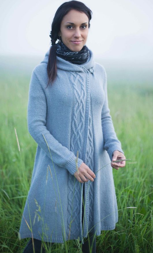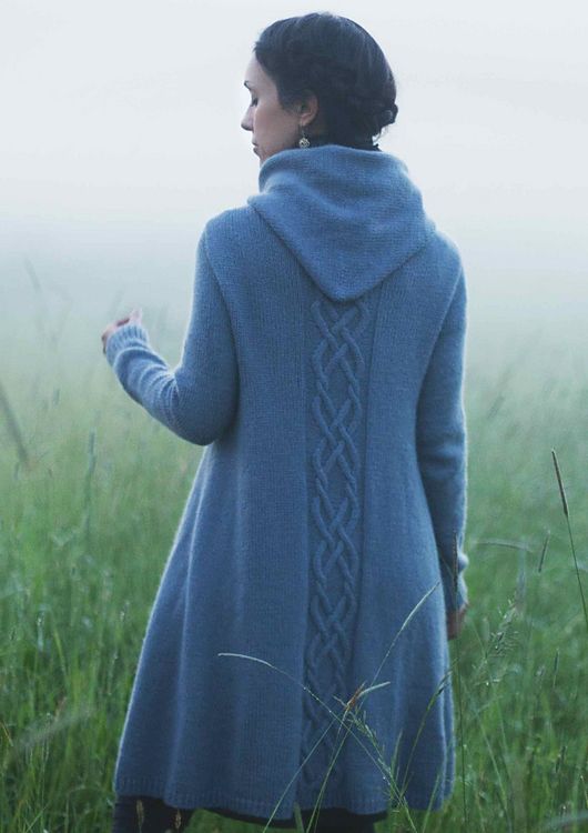 Длинное вязаное пальто Winterfolk свободного расширяющегося книзу силуэта, с большим капюшоном, запахивающимися полочками и красивой линией плеча. Модель сочетает в себе комфорт и прекрасную посадку по фигуре любого типа и размера. Пальто выполнено сверху вниз без швов. Размер капюшона позволит вам легко набросить его на голову и так же легко опустить на плечи. Полочки и спинка пальто украшены причудливым узором из перекрещенных жгутов в ирландском стиле. Длину пальто можно легко отрегулировать и превратить его в эффектную тунику.