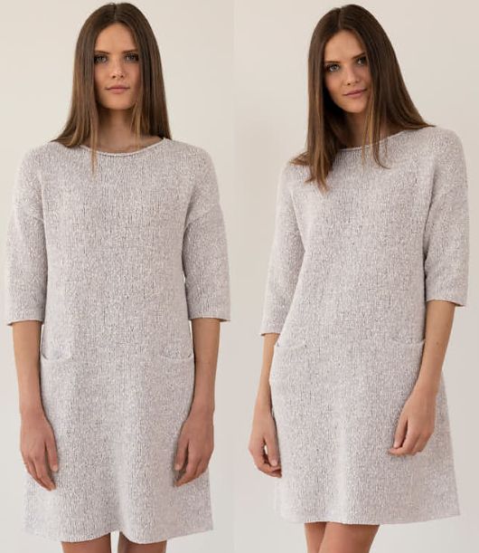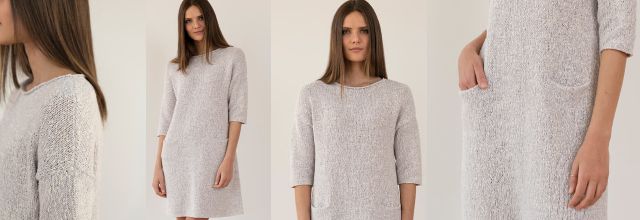 Стильное льняное платье Copley вязаное снизу вверх отдельными деталями, которые затем сшиваются. Для воротничка петли поднять по горловине и вязать по кругу.