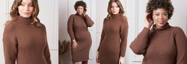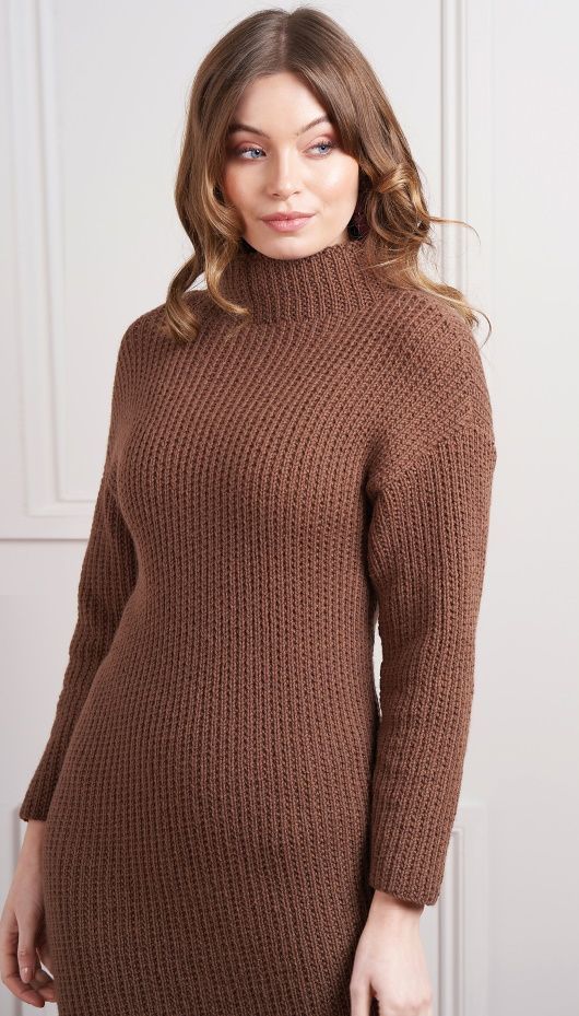 Вязаное спицами платье Eleanorдлины миди имеет приталенный силуэт, но при этом обеспечивает свободу движений за счет особенностей вязки резинкой. Платье со спущенным плечом, рукавами длиной до запястья и воротником-стойкой, отворачивающейся наружу, вяжется снизу вверх поворотными рядами из отдельных деталей, которые затем сшиваются вместе.