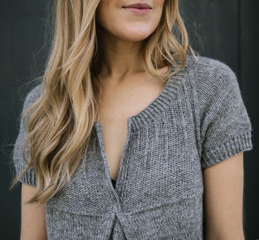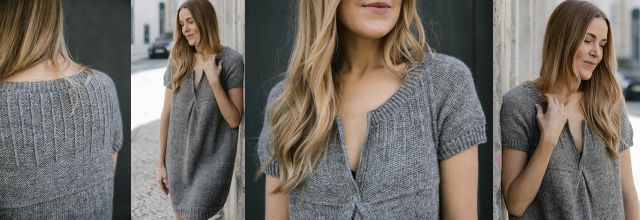 Вязаное платье Lotta выполнено сверху вниз. Верхняя часть тела вяжется прямыми рядами, затем работу соединяют в круг после отделения рукавов. Передняя складка формируется путем набора петель по переду, когда работу соединяют в круг, которые позже будут сложены в складку и закреплены перед провязанной планкой переда.